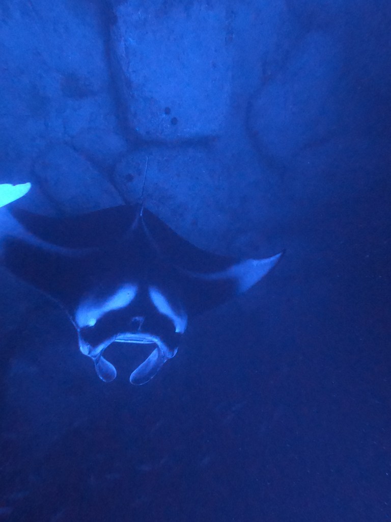 Ein paar Wochen später, als mich meine Freundin aus Deutschland besuchen kam (Ende September) sind wir nach Big Island geflogen. Neben dem Volcanoes Nationalpark der – Achtung Spoiler – momentan kein Lava an irgendeiner Stelle hat, ist die Insel dafür bekannt, dass man mit Mantarochen schnorcheln kann. Durch spezielles Licht wird die Bildung von Plankton angeregt, der Hauptnahrung der Rochen. Über die Jahre haben die Rochen eine Methode entwickelt, um möglichst viel davon aufzunehmen, indem sie an dem Lichtboard eine Rolle rückwärts machen ohne dabei die Schnorchler zu berühren. Das beweist, dass Mantarochen sehr intelligente Lebewesen sind. Wir wurde uns so schön gesagt: „Manta rays are friendly giants“. Das stimmt, denn sie haben nicht einmal einen Stachel. Ein deutlicher Kontrast zu den „gefährlichen“ Galapagoshaien ein paar Wochen zuvor.